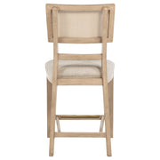 Elevate your dining experience with this stylish counter-height chair, combining natural beauty and modern comfort. Crafted from solid wood, this chair features a hand-woven radio weave cane backrest that adds a light and airy feel to your space. The foam seat cushion, upholstered in soft beige fabric, ensures comfort while dining or entertaining. Designed with clean lines and sturdy construction, this counter-height chair also includes a footrest with a brass-finished metal kick plate for added durability. Perfect for pairing with your counter-height dining table or kitchen island, this chair blends timeless elegance with practical functionality. Key Features: • Counter-height chair crafted from solid wood with a natural beige oak finish • Hand-woven radio weave cane backrest adds an artisanal touch • Foam seat cushion upholstered in soft beige fabric for comfort • Sturdy construction with a brass-finished metal kick plate on the footrest • Ideal for use with counter-height dining tables or kitchen islands