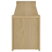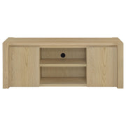Clean lines and a calming finish define this two-door TV stand, where function meets refined simplicity. The open center shelves are perfect for consoles or display, while each door opens to reveal an adjustable shelf for tailored storage. Discreet cord access at the back keeps your setup neat and clutter-free. Crafted from engineered wood with a scratch-resistant and eco-friendly laminate veneer, its light oak finish brings an airy, organic warmth to your living room or media space. Key Features: • TV stand with open shelving and two hidden compartments in a light oak woodgrain finish • Light oak surface delivers natural warmth with a clean-lined, contemporary presence • Two center shelves are ideal for media players, décor, or everyday tech essentials • Each cabinet door conceals an adjustable shelf for flexible, enclosed storage • Rear cord cutouts offer easy wire management and support up to 65 inch TVs • Crafted from engineered wood, melamine paper, honeycomb board, and laminate veneer