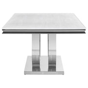 Host family and friends around this sleek, modern glam dining table for an elevated dining experience. Designed with an open demilune pedestal base in a lustrous polished chrome finish, this magnificent, rectangular dining table lends a luxurious look and feel to your space. A spacious tabletop is covered in a white marble paper and features a beveled edge that offers a timeless contemporary touch. The open pedestal base rests on a slim flush base that offers extra stability and a seamless expression. Seat six guests comfortably at this sophisticated dining table. Key Features: • Spacious rectangular table top is perfect for hosting six guests or family members • A white faux marble table top keeps a classic and clean expression to your dining space • An open pedestal base with a flush bottom offers sweeping elegant curves for a contemporary flair • A gleaming polished chrome finish lends a luxurious modern surface • The table top features a charming beveled edge for a timeless touch