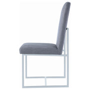 Elevate your dining space with this sleek and modern dining side chair, designed to blend style and comfort effortlessly. The chair features soft upholstery with a padded seat and backrest, providing a cozy seating experience for meals or gatherings. Its open metal frame, finished in polished chrome, creates a minimalist silhouette that adds a touch of contemporary elegance to any room. Perfect for both casual and formal dining settings, this chair complements a variety of decor styles, from modern to minimalist. Enhance your dining area with a chair that brings both visual appeal and functional design. Key Features: • Modern dining side chair with soft, padded grey upholstery • Open metal frame with a polished chrome finish for a sleek look • Comfortable cushioned seat and backrest for relaxed dining • Minimalist design complements contemporary and modern decor • Ideal for dining rooms, kitchens, or as extra seating in any space • Durable construction ensures lasting support and style