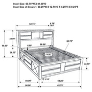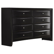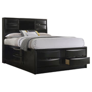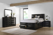 Transform your bedroom with this sophisticated storage bedroom set that combines timeless style and practical function. Finished in sleek black, the platform bed features four drawers in the footboard and hidden compartments behind drop-down doors on the headboard and side rails. The bookcase headboard includes four drawers and a center shelf for accessible storage. Complementary case pieces echo the look with chambered drawer fronts and brushed nickel hardware, creating a refined and cohesive space. Key Features: • Four-piece queen bedroom set with refined transitional styling • Platform bed includes four footboard drawers for added storage • Drop-down doors on headboard and side provide hidden compartments • Bookcase headboard with four drawers and open center display shelf • Chambered drawer fronts enhance texture and dimensional character • Brushed nickel hardware contrasts beautifully with the black finish